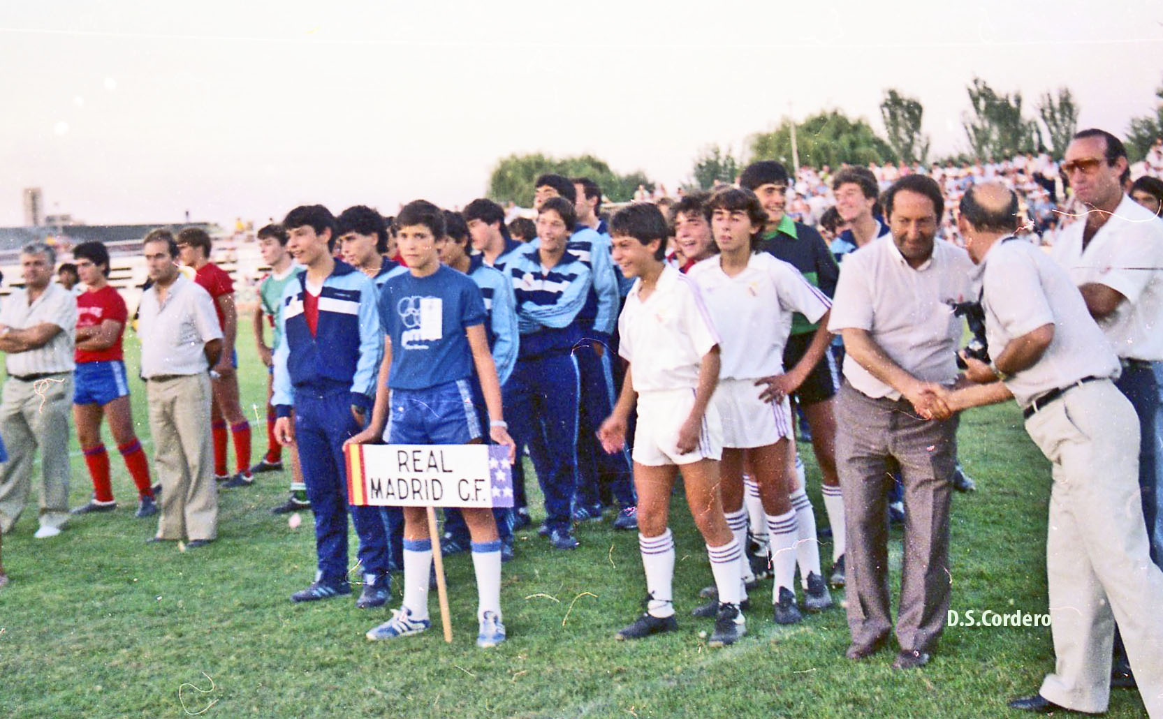 Desde el recuerdo de la primera mitad de los años 80, el famoso jugador de fútbol de los años 50-60, Paco Gento, corresponde al saludo de un aficionado del Deportivo Don Benito.